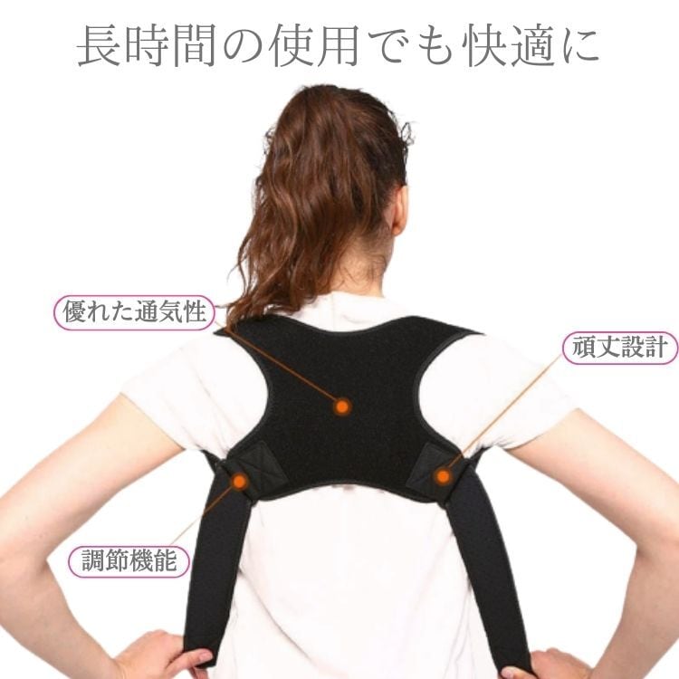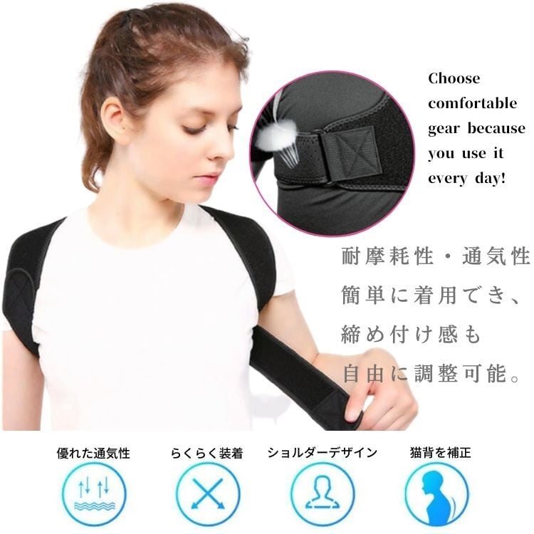 姿勢改善: 猫背補正ベルトは、姿勢を正しい位置に保つためのサポートをします。姿勢を正しくサポートすることで、自然で美しい姿勢を維持することができます。